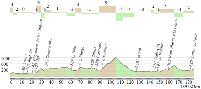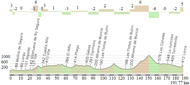 Los primeros km, con paso por Molina de Segura, son básicamente llanos (aunque con una pequeña subida de inicio), pero al dejar atrás Archena y tomar un desvío a la izquierda dará comienzo una suave ascensión en busca de Yechar, con casi 7 km al 3%. Después de una zona llana y el paso por la meta volante de Mula los corredores tendrán que afrontar la primera subida puntuable, el Alto de Pliego-Espuña, con 3 km finales al 5,6 %, siendo junto con la ascensión previa un buen terreno para que se forme la escapada del día.