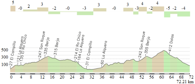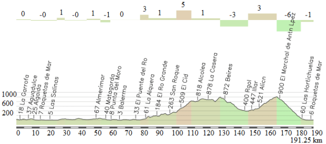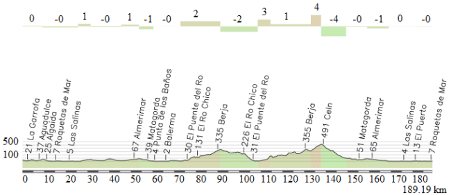 Al igual que sucedió en años anteriores, el perfil oficial está lleno de errores, exagerando algunas cotas, como Rio Chico y La Alqueria, y minimizando otras, como El Aljibe de la Cruz, además de omitir muchos detalles. Por ese motivo hemos utilizado un perfil de elaboración propia (mediante tracks4bikers y siguiendo las indicaciones del rutómetro), que creemos es más realista. De todos modos, hay un desfase de 7 km, saliendo una ruta de 189 km en lugar de los 182 anunciados, por lo que en el análisis nos referiremos a los puntos kilométricos oficiales.