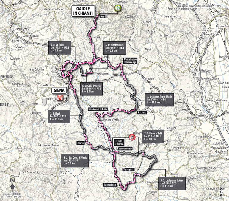 El trazado consta de 188 km, a lo largo de los cuales hay 8 tramos de «sterrato» que acumulan un total de 57,2 km de pistas sin asfaltar, alguno llano pero la mayoría de sube y baja constante, incluyendo en varios casos rampas de gran magnitud.