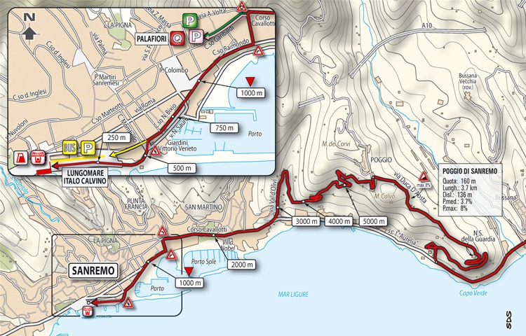 - Poggio di Sanremo (km 291,8): 160 m – 3,7 km – 3,7 %