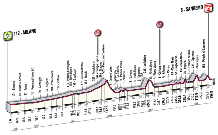 El recorrido de este año es idéntico al de las últimas 5 ediciones, con 298 km y las cotas de Turchino, Le Manie, Cipressa y Poggio como principales dificultades orográficas antes de alcanzar la línea de meta, situada de nuevo en la calle Lungomare Italo Calvino. Lo que si parece que va a ser diferente son las condiciones meterológicas, con pronóstico de lluvia y frío, lo que en caso de cumplirse endurecería la prueba.