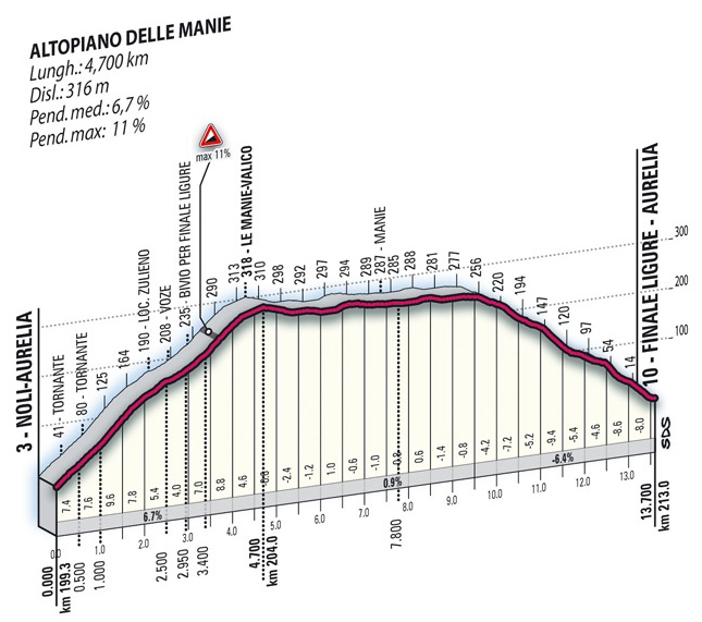 Una vez terminado el descenso, en las afueras de Génova y ya junto a las costas del Mediterráneo, hay 2 repechos tendidos antes de alcanzar la localidad de Varazze, que paso a más de 25 km completamente llanos en busca de Noli, población de inicio del Valico de Le Manie. Se trata de una cota estrenada en la edición de 2008 y que incluye 2 duros tramos de 500 m rondando o superando el 9%, para unos datos totales de 4,7 km al 6,7 %, si bien descontando el falso llano de la cima serían 4,2 km a más del 7 %. Unas cifras ya bastante serias.