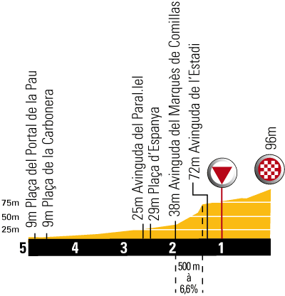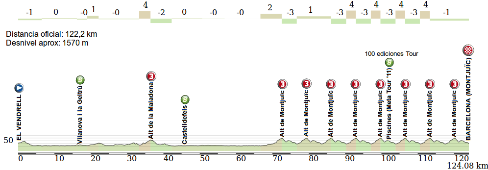 La subida a Montjuic se realizará por la vertiente N, coincidiendo en la 1ª parte con el tramo inicial de subida que se hizo en la Vuelta a España 2012, en el que atacó Contador, aunque luego se seguirá por otra ruta más blanda que la de la Vuelta, para un total de 2 km al 5,7 % según cifras oficiales. En cualquier caso, atención a las duras rampas, con puntas que se acercan al 10 % y pueden romper el grupo si algún corredor importante va con intención. Tras coronar arrancará la bajada, que se verá interrumpida por un repecho al 6% a la altura del Estadio Olímpico Lluís Companys. Al finalizar el descenso se pasará por meta y arrancará la siguiente subida a Montjuïc, sin apenas terreno llano.