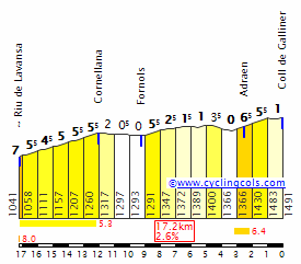 - Coll de Banyeres, n.p. (km 124,1): 1.480 m – 17,3 km – 2,6%