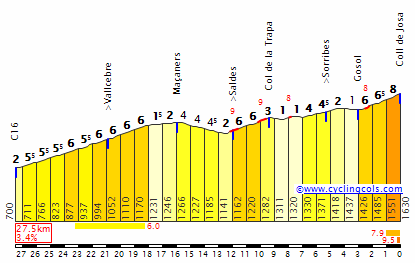 Una vez superada la pancarta del puerto, 2 km de llaneo hasta Maçaners y tras un breve descenso comenzará la subida al Coll de la Trapa, con 3 km al 6-7 % de media, a la que sucederá la ascensión el Coll de Josa -> perfil detallado. Esta última es una subida muy irregular (se podría considerar como un único puerto junto a la Trapa, e incluso junto a Pedraforca/Maçaners), con lo más exigente en los 3 km finales, rondando el 7 % de media y con puntas del 11 %. Tras coronar Josa hay un descenso de 14 kilómetros hasta el Río Lavansa, en las cercanías de Tuixent, donde arrancará la subida al irregular Coll de Banyeres, que si bien carece de grandes rampas y no ha sido marcado como puerto tiene varios km al 5-6%, por lo que dará continuidad al sube y baja constante de la etapa, siendo un terreno muy difícil de controlar.