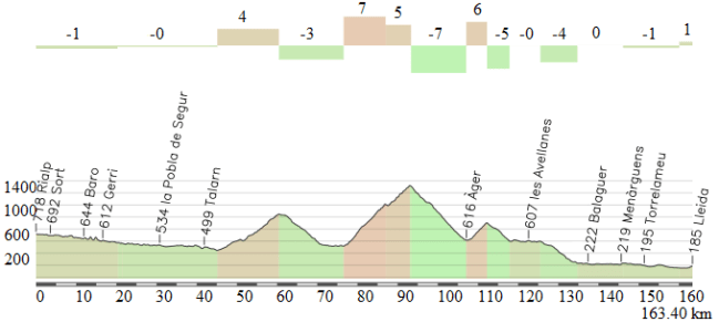 La etapa partirá de Rialp, justo al pie de la subida a Port Ainé, por lo que el traslado será mínimo. Los primeros 65 km son muy llanos, incluso con una ligera tendencia favorable, pasando por varias zonas de túneles, pero tras tomar un desvío hacia el oeste y dejar atrás el pantano de Camarasa empezará la ascensión al Port d’ Àger, de 2ª categoría. La organización sólo ha marcado como puerto los 9,6 km finales, si bien antes ya hay algunos repechos destacables. En cualquier caso, ese tramo es el que tiene mayor continuidad, con 4 km iniciales al 4% y tras 2 km falso llano otros 4 km al 6-7%.