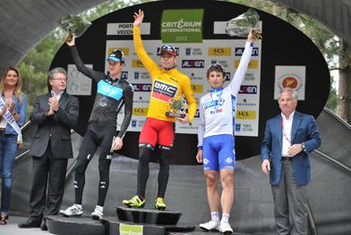El podio de 2012, con Evans escoltado por Fedrigo y Rogers. Fotografía © ASO
