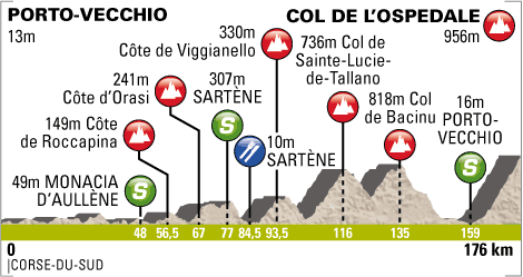 Después de coronar, a 41 km del meta, largo e irregular descenso, con algunos tramos complicados y de mucha pendiente pero también una zona llana intermedia, en dirección a Muratello, dando paso 15 km más o menos llanos en los alrededores de Porto Vecchio, con sprint intermedio incluído, antes de encarar la ascensión final al Col de L´Ospedale: una subida sin rampas muy duras, con sólo un km por encima del 9% (ya cerca de la cima), pero muy constante, sin bajar apenas del 5-6% y con unas cifras oficiales de 14,1 km al 6,2 % de media y casi 900 m de desnivel. Un factor importante será el viento, ya que se trata de una ascensión muy abierta y si sopla de cara puede perjudicar mucho el avance de los ciclistas.