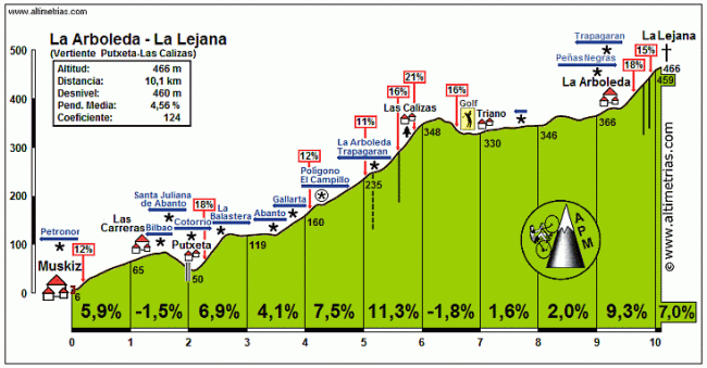 Tras un repecho posterior a Cobarón y su correspondiente bajada se volverá a circular por Muskiz, repitiendo el repecho de Las carreras solo que en esta 2 ocasión tomando un desvío hacia Putxeta, para tras un corto descenso afrontar un muro de unos 600 m al 12-13 % de media y con puntas del 18 %. Tras un km llano se reanuda la subida, primero por la carretera principal, por donde se habrá bajado anteriormente, y después tomando el desvío a Las Calizas, una vía secundaria con rampas de hasta el 21 % que forma parte de la lista de rampas máximas superadas en competición. De todos modos, aunque creemos que se va a subir por ahí no podemos asegurarlo al 100 %, ya que el rutómetro no especifica ningún cambio de ruta desde Putxeta hasta la Arboleda.