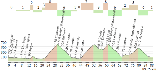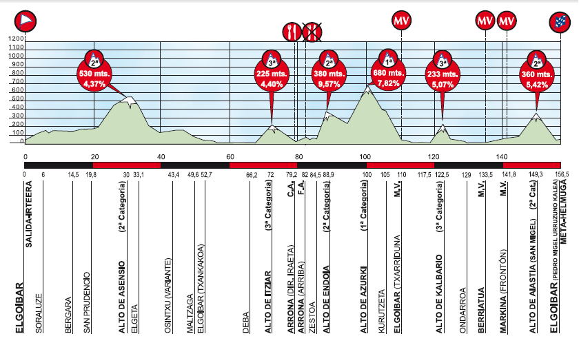 Última etapa en línea y la jornada más dura de toda la carrera, con nada menos que 10 subidas puntuables (más otras 5 cotas de cierta dureza) entre las localidades de Eibar y Beasain, incluyendo casi de salida Urraki + Santa Ageda y ya en los alrededores de Beasain el Alto de Barbari y un triple paso por la explosiva cota de Olaberría, con rampas del 20 %