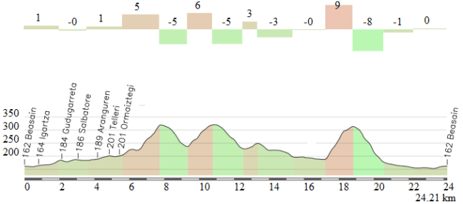 El descenso de Barbari, de unos 4 km y complicado en caso de lluvia, termina en los alrededores de Zegama, dando paso a unos 8 km llanos, con travesía incluída por la localidad de Segura, hasta llegar al inicio del último paso por Olaberría, cuyas duras rampas, con un km inicial en torno al 11 % de media, deberían ser clave en la resolución de la jornada. Una vez coronado faltarán sólo 6 km para el final de etapa, los 2 primeros de bajada pero el resto llanos, con la línea de meta en la avenida frente a la estación de tren de Beasain, en sentido inverso a otras llegadas en esta localidad -> noticia.