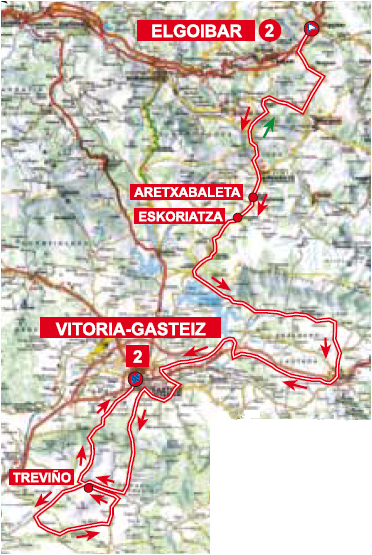 La 2ª etapa es la más larga de toda la prueba, con 170 km entre Elgoibar y Vitoria-Gasteiz, incluyendo 2 puertos bastante duros en los primeros 50 km km y varias ascensiones mas tendidas en la parte final, con el Alto de Zaldiaran a 9 km de la llegada en la capital alavesa.