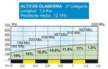 Tras el descenso de Zerain se pasará por la localidad de Segura, con varios km llanos hasta el inicio de la explosiva cota de Olaberria, que se subirá por una vertiente inédita que parte desde una zona de polígonos industriales, a mitad camino entre Idiazabal y el propio Beasain. Según el perfil oficial tendría 1,4 km al 12,1%, con un primer km al 14,5%. Pero de acuerdo a los mapas y salvo que se haya acortado recientemente la subida, esas cifras serían erróneas, quedando en realidad 1,5 km al 9% (aprox.), con un km inicial duro pero no extremo, al 11%. En cualquier caso, una ascensión muy exigente, donde a poco que el ritmo sea elevado se romperá el grupo, sobre todo en la última de las subidas.