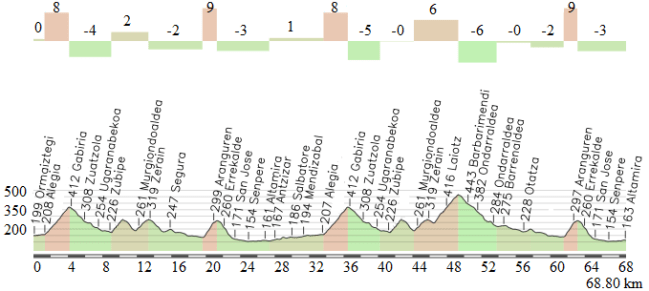 Los primeros 35 km, casi siempre en dirección norte, no tienen dificultades reseñables, pero al dejar atrás el pantano de Urrunaga y tomar un desvío hacia el oeste se entra en un terreno mas «pestoso», con los repechos de Etxaguen y Manurga-Zarate, este último marcado de 3ª, aunque en realidad la localidad de Zarate está en un falso llano posterior a la verdadera subida, con 1,3 km al 6,4%. Desde ahí se llega rápidamente a Altube, afrontando el descenso del puerto homónimo (hasta el km 3,6), que termina con el duro repecho de Astobitza-Las Chozas, con 2 km al 5 % de media.