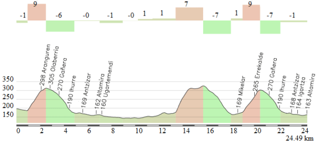 Perfil aproximado de la contrarreloj, con las cotas de Lierni, Serain y Olaberría. Click para ver el mapa.