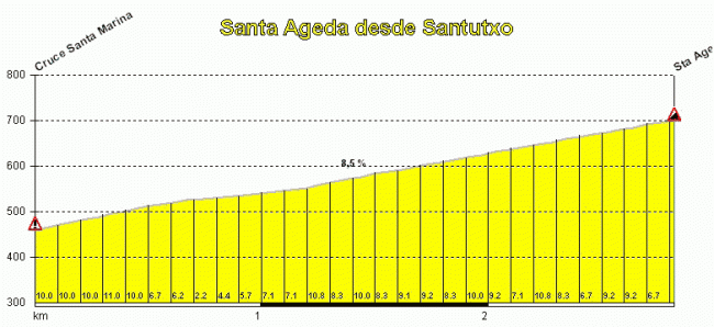 Terminada la ascensión hay un corto descenso (hasta el km 5) en dirección a Goian y el cruce de Puerto Bidania, dando paso a un tramo más o menos llano hasta llegar a Santutxo, donde se tomará un desvío hacia el oeste en busca del Puerto de Santa Ageda, catalogado de 3ª pero que con casi 3 km al 8,5 % de media y largos tramos sostenidos al 10 % es una buena encerrona, siendo más duro que otros puertos considerados de 2ª.