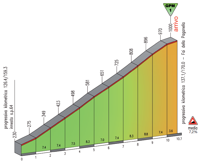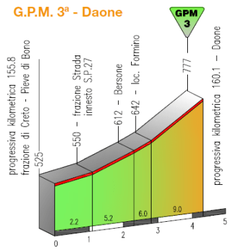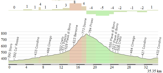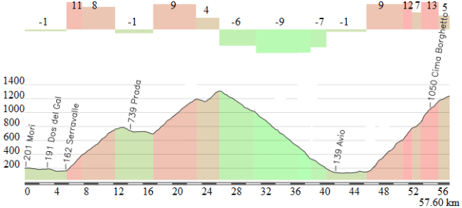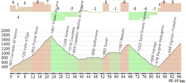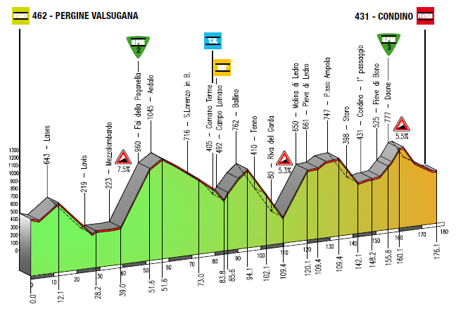 Dura etapa de media montaña entre Pergine Valsugana y Condino, con 4 puertos aunque sólo 2 de ellos contarán para la clasificación de la montaña: Fai della Paganella, la subida más exigente de la jornada con 9 km centrales a casi el 8 % de media, y ya más cerca de la llegada Daone, una ascensión corta pero con un duro tramo final y que se corona a 16 km de meta (al menos oficialmente, ya que superada la pancarta de puerto hay un repecho donde se alcanza mayor altitud). Desde el final del descenso hasta meta restarán unos 10 km de falsos llanos, la mayoría favorable pero con los 2 últimos picando ligeramente hacia arriba.