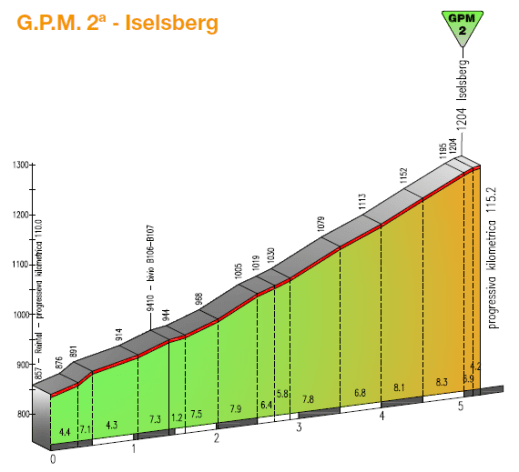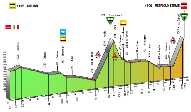 La etapa más larga de esta edición, con 225 km entre la localidad de Sillian, en Austria, y Vetriolo Terme, ya en territorio italiano, incluyendo además de la dura subida final, con unas cifras oficiales de 13,3 km al 7,6 % de media, el larguísimo Passo Lavaze, con más de 1500 m de desnivel, aunque con la cima situada muy lejos de meta, habiendo terreno para el reagrupamiento. No obstante, a poco que haya ritmo el desgaste se notará en la subida final, pudiendo haber buenas diferencias en meta.