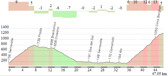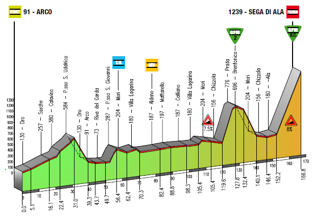 La carrera se despide con la etapa más «mediática» de esta edición, con llegada en el inédito y durísimo Sega di Ala, una ascensión con un coeficiente superior a los 350 APM, y la subida previa a Prada-Brentonico, más corta pero también con km enteros por encima del 10 %, pudiendo realizar una buena selección antes del coloso. A priori, una etapa completamente decisiva para la general final, en la que además de la dureza del recorrido se notará el desgaste de los días previos, pudiendo haber importantes diferencias en meta.