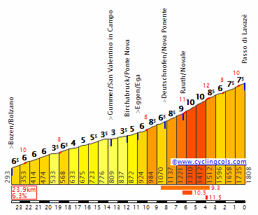 La dura subida a Lavaze, con 10 km finales al 8,3 %. Perfil de cyclingcols, click para ver datos y galería fotográfica