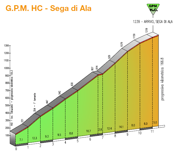 En la última jornada se producirá el mencionado estreno de Sega di Ala, una ascensión durísima (y lo sería aún más si se subiera el puerto entero) con km enteros al 14% y puntas del 20%, entrando en las listas de km más duros en competicion y rampas máximas, además de en la de puertos. Previamente los ciclistas tendrán que haber superado Prada-Brentonico, una subida ya muy seria con 7 km a casi el 9 % de media.