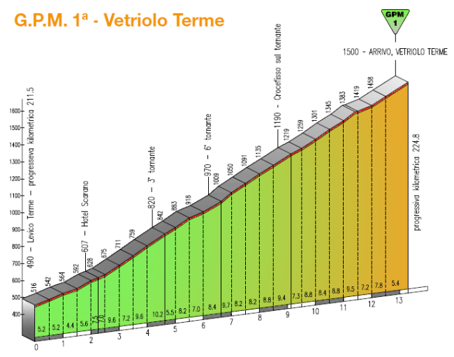 Un enlace para poder ver la carrera en directo, restando en estos momentos 13 km para la línea de meta (la subida a Vetriolo Terme completa):