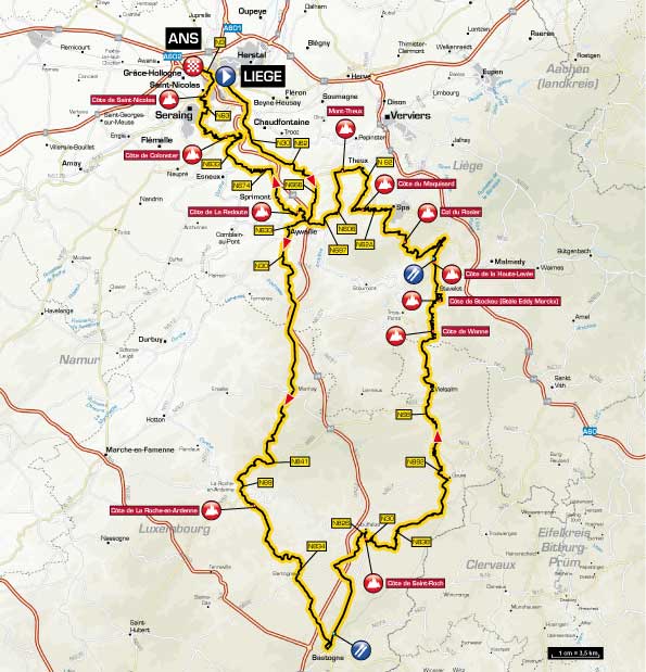 Los primeros 100 km, en dirección sur, transcurren por un terreno «pestoso» pero sin grandes subidas, con la única cota oficial de la Roche en Ardenne. Al llegar a la rotonda Doyenne, en la localidad de Bastogne, la ruta gira hacia el norte, encarando ya la vuelta hacia Lieja. El primer aviso de lo que espera a los corredores es la cota de Saint Roch, con 1 km al 11 %, aunque no será hasta pasado Neuville, a 104 km de meta, cuando el trazado se endurezca de verdad con el encadenado de Wanne, Stockeau, Haute Levee y Rosier sin apenas llano intermedio. Probablemente la más exigente es Wanne, con 2,7 km al 7,3 %, pero Stockeau es a priori la más rompedora, con un km entero por encima del 12 %, formando parte de la lista de km más duros superados en competición. Cabe señalar que en el cruce superior hay un monumento dedicado a Eddy Merckx.