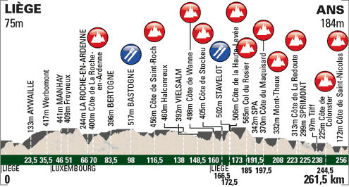 En definitiva, un recorrido muy exigente pero con la incógnita de como afectará la eliminación de Roche aux Faucons, la subida clave de los últimos años, y la inclusión en su lugar de la más tendida cota de Colonster, pudiendo provocar que los corredores intenten romper la carrera en las subidas previas, recuperando protagonismo La Redoute … o por el contrario, que la lucha entre los favoritos quede reducida a la parte final, llegando un grupo numeroso a los pies de Saint Nicolas.