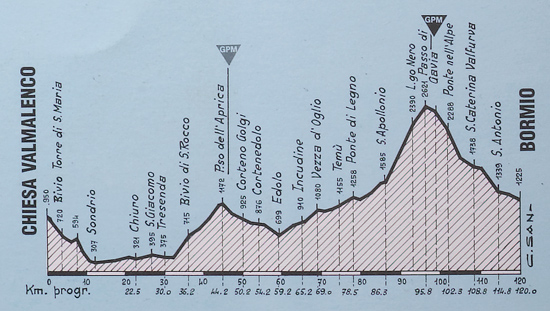 Doce menos veinte de la mañana, y eran de la partida en Chiesa Valmalenco 154 corredores. Al acabar la jornada quedarían 139 ciclistas, bueno, no eran ciclistas, eran héroes … ‘Il patrone’ Torriani decidía finalmente que la ruta programada se iba a cumplir, se ascendería el Passo Gavia … y se bajaría. El primer movimiento importante lo iban a protagonizar en las rampas de Aprica los corredores Stephan Joho y Roberto Pagnin, de los equipos Ariostea y Gewis respectivamente, que coronaban con casi un minuto de ventaja sobre un pelotón que ya intuía que la subida al Gavia podía ser tremenda. El gran grupo era liderado por el equipo del Tongo, que defendía a su líder Chioccioli pero también a Giupponi y Saronni.
