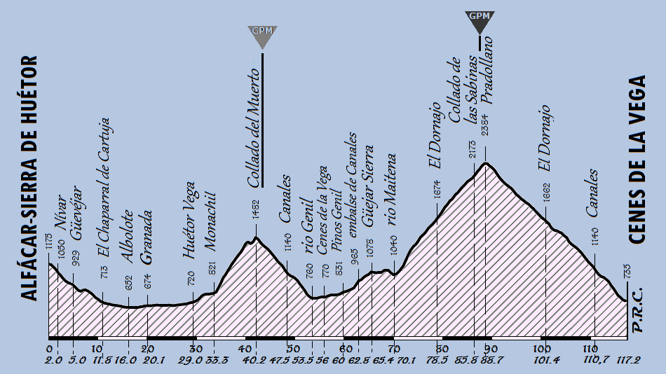 Como bien dices, la vertiente del Hotel del Duque tiene un comienzo durísimo, aunque a veces no queda del todo reflejado en las altimetrías que incluyen la subida a Güejar Sierra. En cuanto al rodeo por Cenes de la Vega, lo hemos hecho voluntariamente para aumentar el tramo de falso llano entre puertos y asemejarlo más a la etapa de Bormio, que tiene casi 20 km entre Édolo y Ponte di Legno, mientras que con el rodeo por Cenes llegamos a 17 km aproximadamente.