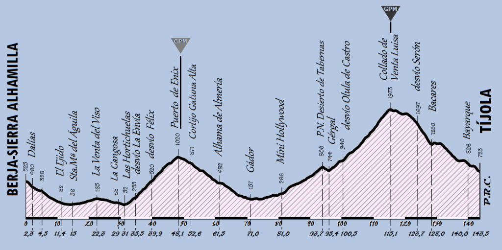 Tras el descenso de Sierra Alhamilla y una zona más o manos llana de 20 km, la 1ª ascensión sería el Puerto de Enix (Sierra de Gador), sin rampas fuertes pero bastante largo, con 16 km a casi el 6% de media. Su tendida bajada llevaría a los corredores hasta Gador, dando paso a una zona de falso llano antes de iniciar la subida a Gergal por una carretera paralela a la autovía y atravesando el desierto de Tabernas, por lo que el sol podría hacer de las suyas. Después de un altillo y una corta bajada la ascensión continúa, ya con pendientes más elevadas, hacia el Collado de Venta Luisa, que si bien descontando la subida previa a Gergal no alcanza la dureza del Gavia si se puede considerar un Especial, con 1250 m de desnivel y varios km enteros por encima del 9%.
