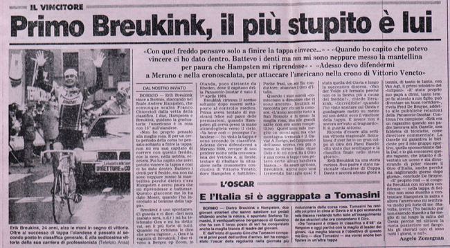 Habíamos presenciado una etapa de otra época, que iba a marcar la carrera deportiva de muchos de sus protagonistas, y que sobretodo les iba a entregar el carnet de ciclista para siempre. Ya en páginas interiores el titular no podía ser más gráfico, «Primero Breukink, el más estúpido de todos», en un artículo escrito por el periodista Angelo Zomegnan … años más tarde director de la carrera.