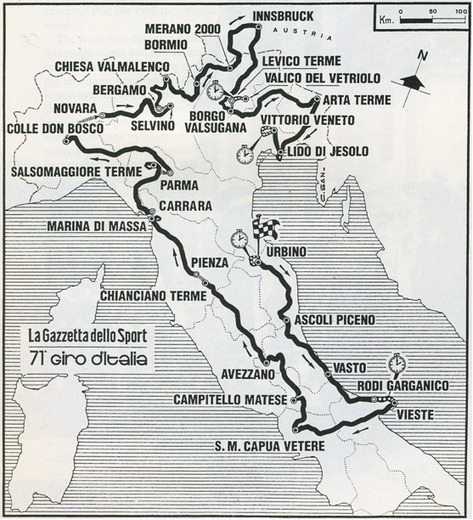 El recorrido no era a priori nada del otro mundo, si bien estaba equilibrado. Había 4 cronos pero muy diferentes entre sí: prólogo, contrarreloj por equipos, cronoescalada y crono individual llana el último día. Por otro lado, las llegadas en alto a Campitello Matesse, Selvino y el durísimo Merano 2000, junto a otras etapas de montaña como las de Bormio con el Gavia y Chiesa Valmalenco (hasta el km 12) con el espectacular San Marco, apuntaban a un corredor completo de cara a la victoria, habiendo además una incursión en Austria a través del impresionante Passo del Rombo (Timmelsjoch), aunque muy lejos de la llegada en Innsbruck.