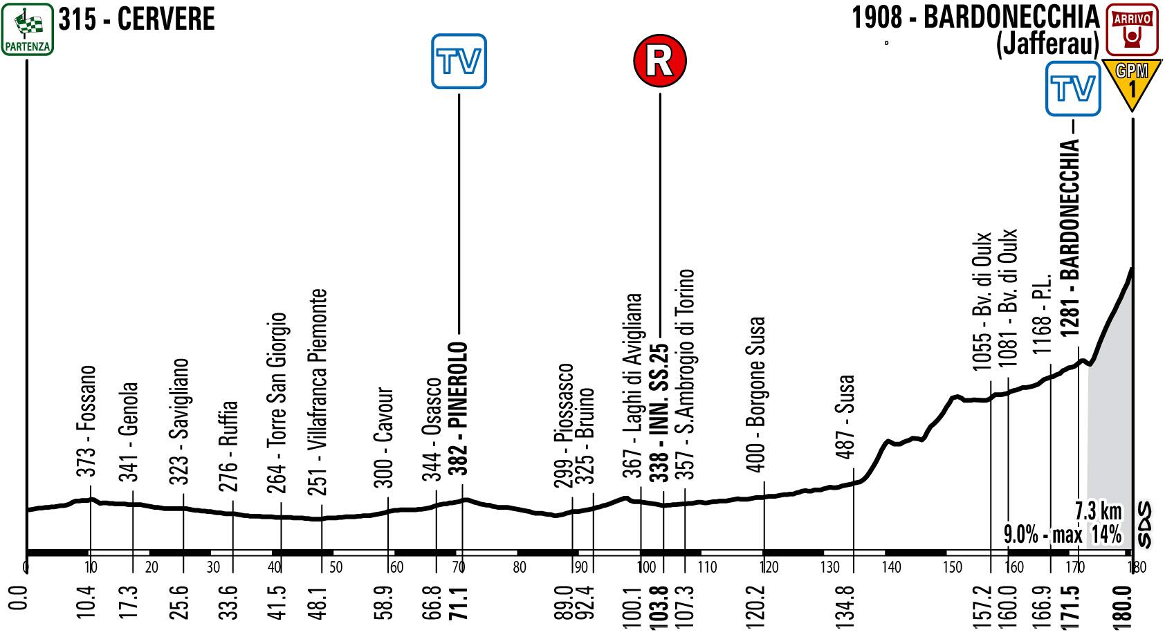 14ª ETAPA (Sábado 18 Mayo): CERVERE – JAFFERAU (BARDONECCHIA) (168 km). Rutómetro / Últimos km