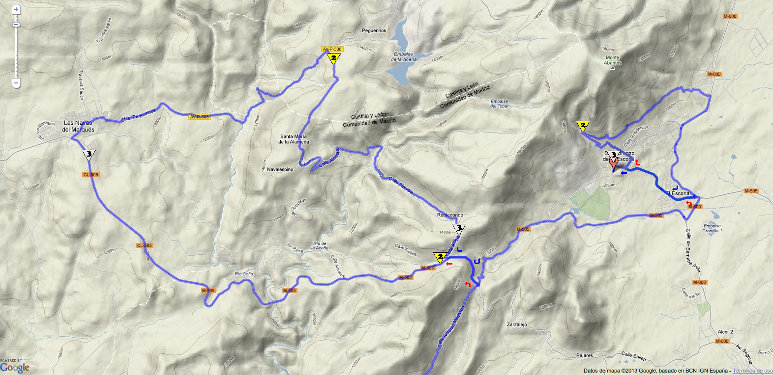En el puente del Río de la Aceña se vuelve a empinar la carretera hacia Robledondo, un puerto regular en torno al 5 o 6% en todo momento. Tras 12 km favorables se llega a San Lorenzo del Escorial para afrontar el durísimo bloque final, donde sin duda se decidiría la carrera. En este primer paso se sube dirección al Monasterio, con algunos tramos duros y 800 m empedrados, pero en vez de entrar a su patio se gira a la derecha para llegar a la calle Cañada Nueva y sus ya famosas pendientes del 23%. Estos 800 m al 14,5% deben ser el punto definitivo donde se rompa la carrera en pequeños grupos. Tras una mini bajada, se sigue ascendiendo durante 1,1 km al 7%, un terreno interesantísimo, con el grupo desperdigado y las piernas en carne viva. Puede ser decisivo, igual que lo ha sido el terreno de subida a Boncelles que sigue a la Roca de los Halcones cuando ésta se ha pasado en la Lieja – Bastoña – Lieja.