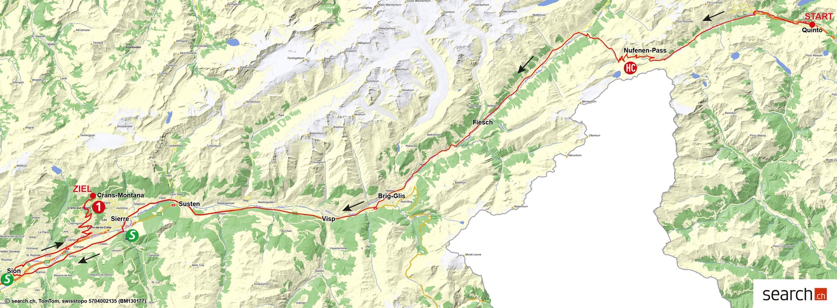Originalmente, la 1ª etapa en línea iba a unir Quinto con la estación de esquí de Crans Montana, en el cantón de Valais, pero debido a la nieve en Nufenenpass, un duro puerto de casi 2500 m de altitud, los organizadores anunciaron poco antes de que empezar la carrera que la salida sería desde Ulrichen, a los pies de la vertiente norte de Nufenen, quedando una etapa muy corta aunque manteniendo la subida final a Vermala, en Crans Montana , con unas cifras oficiales de 17 km a casi el 7 % de media.