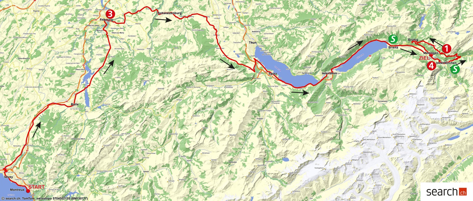 3ª ETAPA (Lunes 10 junio): MONTREUX – MEIRINGEN (204,9 km). Rutómetro / Mapa llegada