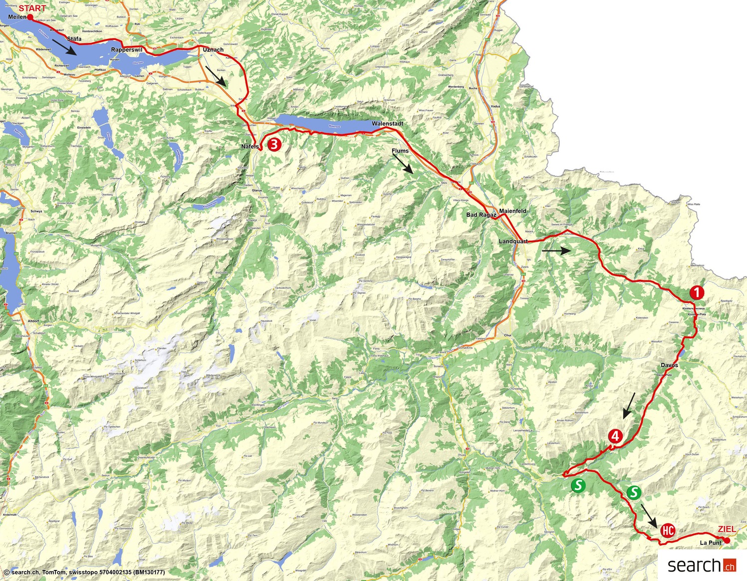 La etapa reina, con 206 km de recorrido entre Meilen y la pequeña población de La Punt-Chamues, en el cantón de Grisons y muy cerca de la frontera con Italia, teniendo que superar en la 2ª mitad de la ruta los puertos de Wolfgangpass, irregular pero con tramos duros, y Albulapass, una preciosa y exigente subida con 17 km finales al 6,9% de media, incluyendo 2 largos tramos al 9% aunque separados por un descansillo, con los últimos 7 km ya muy constantes en torno al 7,5%.