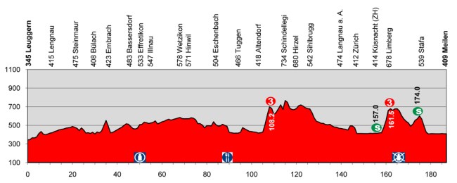 En vísperas de la jornada reina, etapa quebrada entre Leuggern y Meilen, localidad perteneciente al cantón de Zurich y situada junto al lago homónimo, con los puertos de Schwandistrasse, marcado de 3ª aunque por dureza sería un 2ª, y Limberg, con 3 km centrales a casi el 7%, como mayores dificultades. Desde este último restarán 26 km a meta, con los 8 km finales totalmente llanos, por lo que los velocistas que superen bien las pequeñas cotas pueden volver a tener su oportunidad, aunque habiendo también opciones para las fugas.