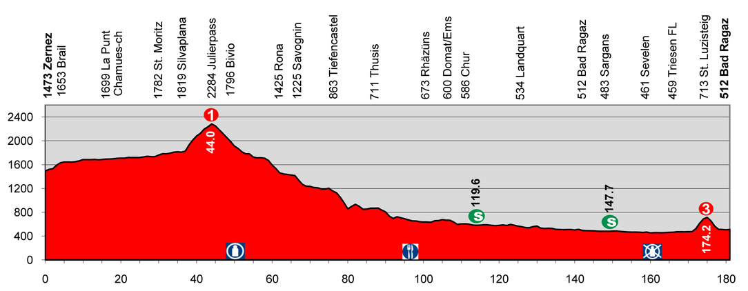 Después de la jornada de La Punt y en vísperas de la crono de Flumserberg, llega una etapa a priori más sencilla uniendo las localidades de Zermez y Bad Ragaz, en el cantón de San Galo, muy cerca de Liechtenstein, pero teniendo que superar Julierpass casi de salida y ya en la parte final la cota de Luzisteig, cuya pancarta estará a sólo 6 km de meta, restando 1 km de suave ascenso, 3 de bajada y los 2 últimos llanos. Una etapa imprevisible, con oportunidades tanto para fugas lejanas como para ataques en los últimos km y pudiendo resolverse también mediante un sprint reducido.