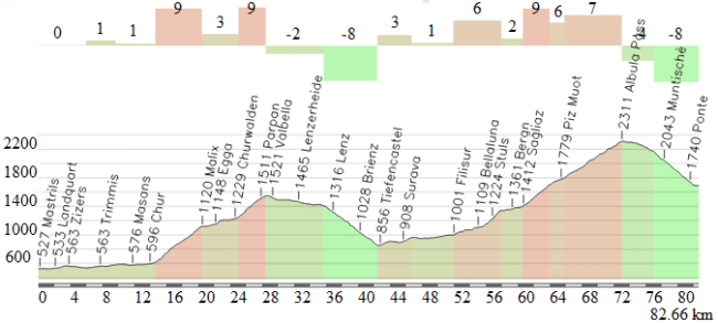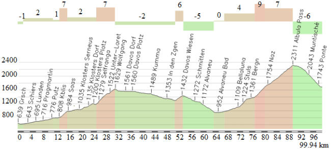 Desde la cima de Albula habrá menos de 10 km hasta la línea de meta, con un inicio de bajada muy tendido pero seguido por 6 km de vertiginoso descenso, con mucha pendiente y zonas muy técnicas (aunque por buena carretera), y medio km final, ya en las calles de La Punt, completamente llano.