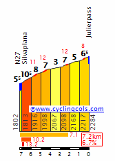 - Julierpass, 1ª (km 44): 2.284 m – 7,1 km – 6,5 %