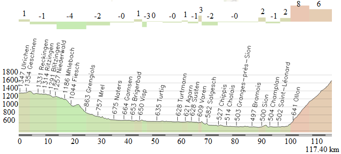 2ª ETAPA (Domingo 9 junio): ULRICHEN – CRANS MONTANA (119,5 km). Rutómetro* / Mapa llegada (*debido a la nieve se saldrá desde Ulrichen)