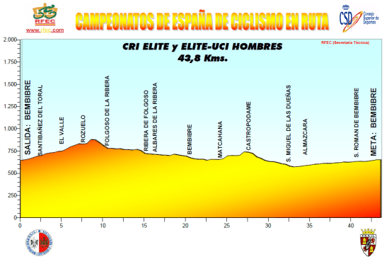 Centrándonos en las pruebas élite-uci masculina, la contrarreloj de este año tiene características muy similares a las de las 2 últimas ediciones, con algo más de 40 km y un pequeño puerto casi de salida, en este caso el irregular Alto de Rozuelo, con 800 m finales al 7%, siendo el resto del recorrido propicio para rodar a altas velocidades (a excepción del repecho de Castropodame), con un trazado en forma de 8 alrededor de Bembibre. Globalmente, una contrarreloj muy favorable para los corredores potentes.