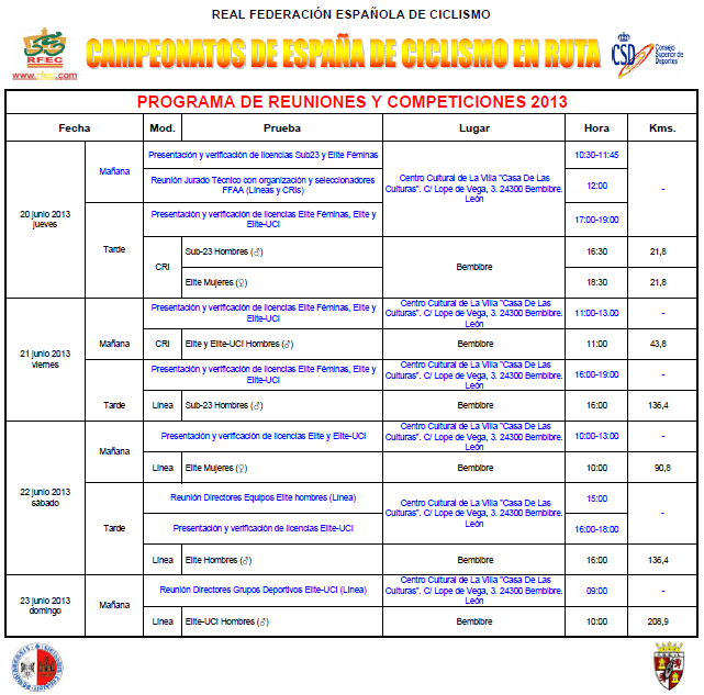 Por otro lado, hay que agradecer a las autoridades de Bembibre el esfuerzo realizado para acoger la prueba, máxime en estos momentos de crisis económica. En cuanto a la retransmisión televisiva, lamentablemente no habrá TV en directo, aunque si varios resúmenes: el sábado y domingo por la noche en RTVCyL, de 10-15 minutos de duración cada uno de ellos; y el domingo a las 22.30h en Teledeporte, en este caso de media hora de duración e incluyendo imágenes de todas las pruebas -> comunicado oficial.
