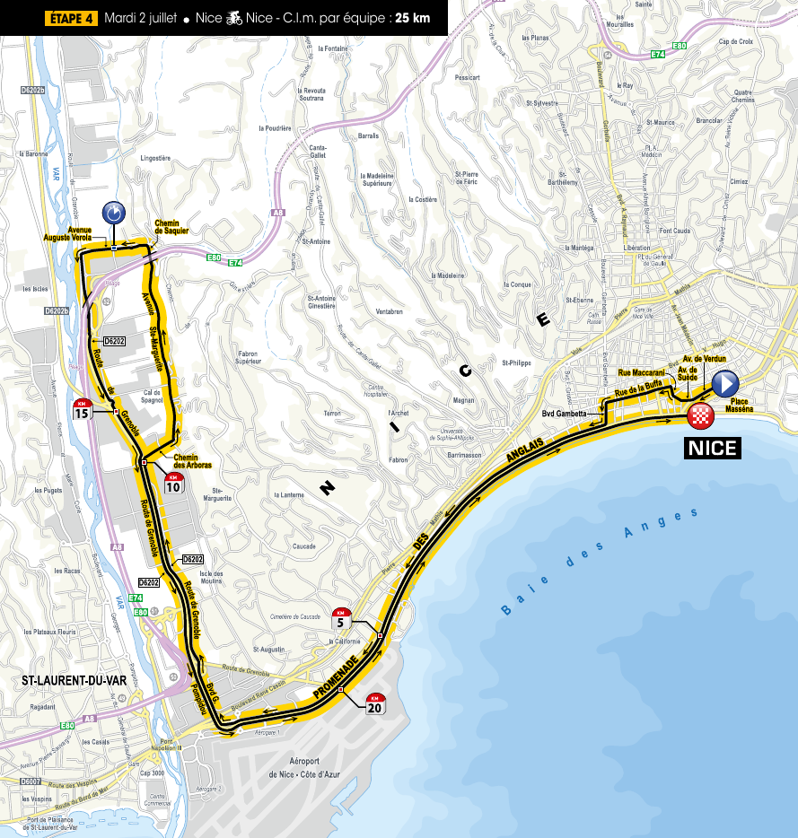 En la 4ª etapa, ya en la Francia continental, le tocará el turno a una contrarreloj por equipos con salida y llegada en la ciudad de Niza, en el departamento de Alpes Marítimos, con un trazado de «ida y vuelta» que no ofrece dificultades reseñables, siendo en general bastante rectilíneo (salvo en los 2 km iniciales y el tramo central) y muy llano.