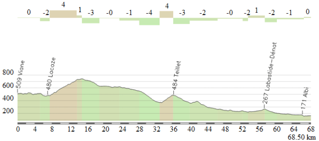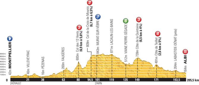 En vísperas de la etapas pirenaicas, jornada de media montaña con llegada en Albi, en el departamente de Tarn, con un trazado exigente en su parte central al incluir los puertos de 13 Vents, con 4 km finales al 6,3%, y Croix de Mounis, irregular pero con varios km enteros al 8-9%, teniendo que superar en el tercio final las tendidas cotas de Quintaine y Teillet, aunque de todos modos están muy lejos de meta, con 25 km finales prácticamente llanos.