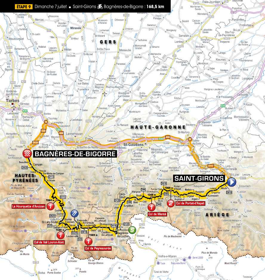 9ª ETAPA (Domingo 7 de Julio): SAINT GIRONS — BAGNÈRES DE BIGORRE (168,5 km). Info oficial / Últimos km