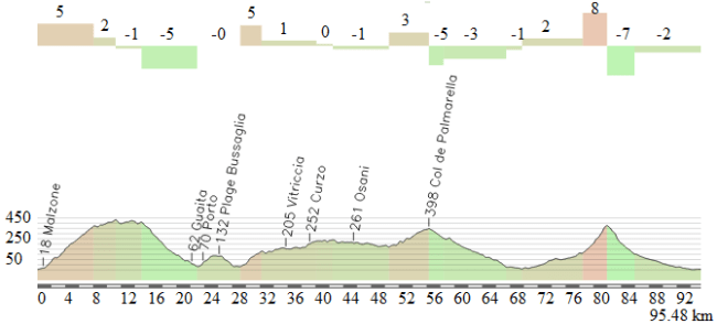 - Col de Palmarella, np (km 106): 401 m – 5 km – 3,3 %