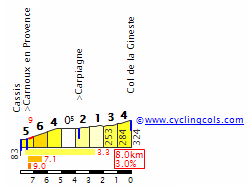 - Col de la Gineste, np (km 216): 326 m – 7,4 km – 3,1 %
